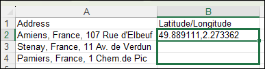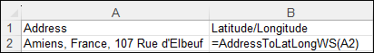 3. Saisissez les références de cellule ou d'autres données dans la fenêtre Arguments de la fonction, puis cliquez sur OK. Dans l'exemple ci-dessous, la fonction AddresstoLatLongWS obtient la latitude/longitude d'une adresse.